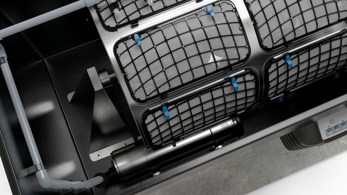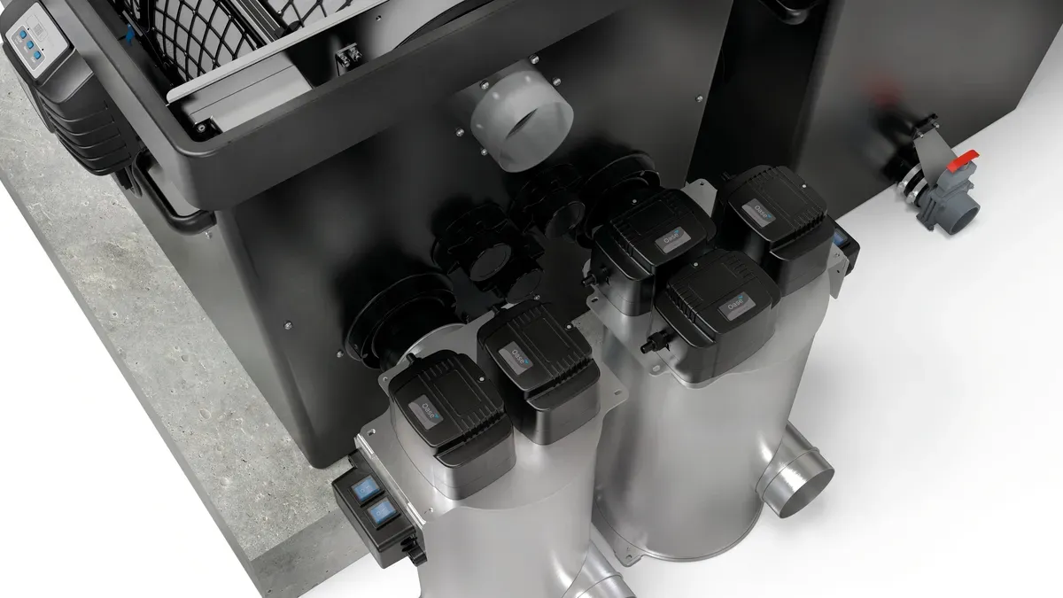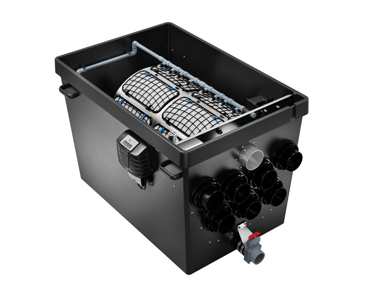 Professional modular filter system for large natural and swimming ponds up to 530 m³ and koi ponds up to 100 m³ for outstanding water quality in the smallest of spaces – thanks to particularly high filter performance with intelligent control functions and intelligent self-cleaning function for unique freedom from maintenance (drum filter module). All settings can be conveniently controlled via APP by connecting the system to the OASE Control System. The removal of pollutants is even more effective thanks to the high-performance OASE PondPads filter media and develops its optimum performance in the new fluidised bed process (moving bed). For large pond owners who want more, high degradation rates of ammonium, ammonia, nitrite and nitrate through larger Moving Bed modules for up to 150 litres of Hel-X, especially in combination with the new OASE PondPads biofilter media, ensure even greater performance.