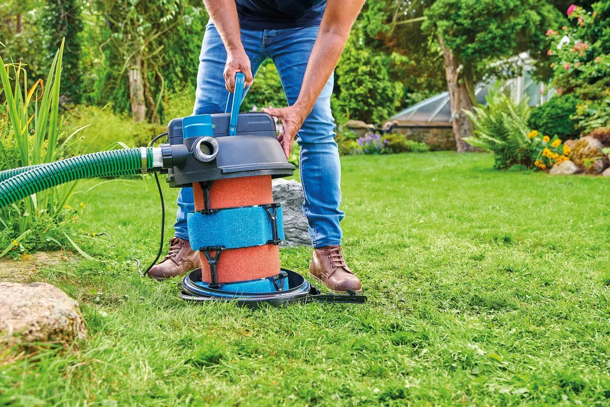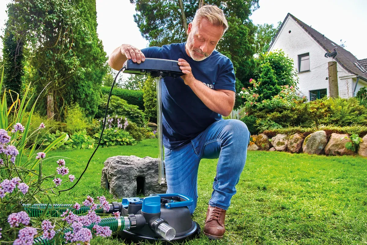 Complete set: install, connect, finished. Guaranteed clear water through the ideal combination of filter, pump and UVC technology for sterilisation. The filter is buried up to the cover and is virtually invisible in the garden. Maintenance is very easy thanks to the patented cleaning function in the cover. The degree of waste build up on the filter can be seen from outside. If desired, this solid pressure filter can also transport water to a higher watercourse.
