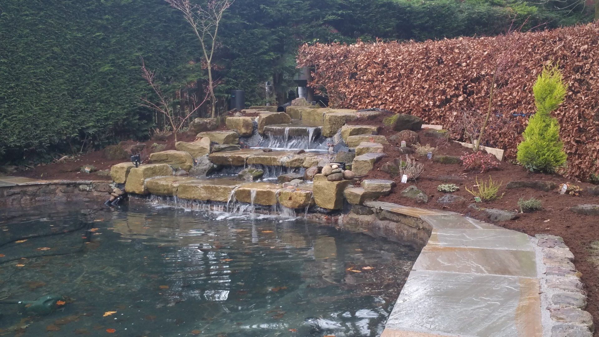 A 13,500 Gallon concrete koi pond build and landscaped by us.